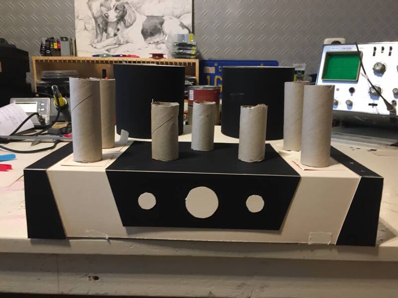 Na de el 84 werd het tijd voor iets groters met wat meer design, dat was mijn gedachten. Ik heb van karton eerst een model gemaakt en nadat ik daar over tevreden was heb ik langzaam de onderdelen bij elkaar gespaard. Deze versterker zou ong 40w in klasse B moeten leveren met 12 watt klasse A. Ik wilde ook werken met dezelfde buisvoet om hetzelfde type buis te gebruiken, puur voor het design. De buizen zijn 1x 12sn7 als voorversterker, 2x 6sn7 als fasedraaier en daarachter komen dan de KT77.