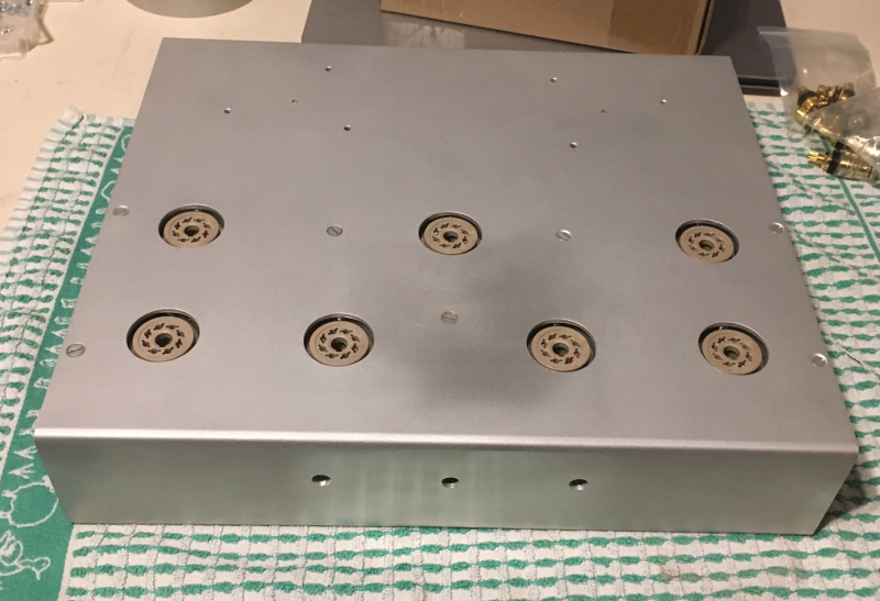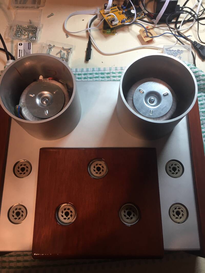 Omdat je niet wil dat terwijl de gloeispanning er nog niet opstaat de volle 400v er op komt is er een inschakelvertraging ingebouwd die ongeveer 20sec. wacht voor de spanning er op komt, anders zouden de elco's wel een flinke oplawaai krijgen. Vervolgens heb ik de aluminium kast laten buigen en maken en ben ik begonnen met hout te zagen, te lijmen en te schuren en er daarna een 5 tot 10 lagen blanke lak op te zetten nadat ze waren gebeitst op kleur.