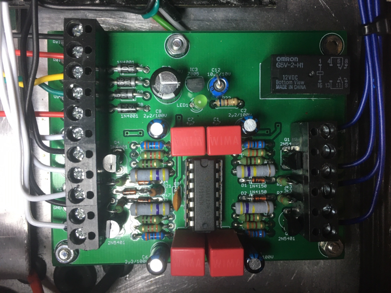 Hierboven staat het printje met de auto bias en daarnaast rechts de volumeregeling en aan/schakelaar met de afstandsbediening te regelen. Dit functioneert prima, na de vorige versterker merkte ik dat ik dat echt miste, zodat je lekker op de bank kon blijven zitten. Hieronder staat de versterker kompleet afgebouwd en werkend op de kast.